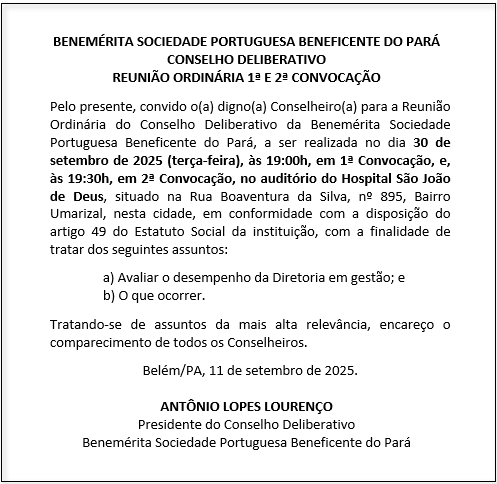O Presidente do Conselho Deliberativo da Benemérita Sociedade Portuguesa Beneficente do Pará, Dr. Antônio Lopes Lourenço, convida os(as) dignos(as) Conselheiros(as) a comparecerem à Reunião Ordinária do Conselho Deliberativo, a realizar-se no dia 30 de setembro de 2025 (terça-feira), às 19:00h, em 1ª Convocação, e, às 19:30h, em 2ª Convocação, no auditório do Hospital São João de Deus, situado na Rua Boaventura da Silva, nº 895, Bairro Umarizal, nesta cidade, conforme a previsão do artigo 49 do Estatuto Social da instituição, com a finalidade de tratar dos seguintes assuntos: