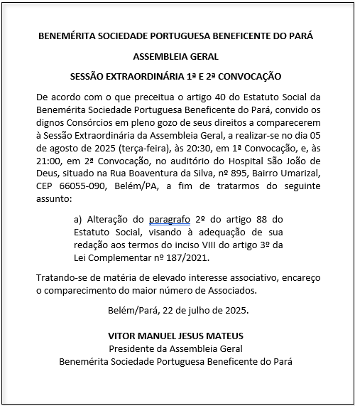 O Presidente da Assembleia Geral da Benemérita Sociedade Portuguesa Beneficente do Pará, Dr. Vitor Manuel Jesus Mateus, convida os dignos Consórcios a comparecerem à Sessão Extraordinária da Assembleia Geral, a realizar-se no dia 05 de agosto de 2025 (terça-feira), às 20:30, em 1ª Convocação, e, às 21:00, em 2ª Convocação, no auditório do Hospital São João de Deus, situado na Rua Boaventura da Silva, nº 895, Bairro Umarizal, CEP 66055-090, Belém/PA, conforme as disposições previstas no artigo 40 do Estatuto Social da Instituição, com a finalidade de tratar do seguinte assunto: