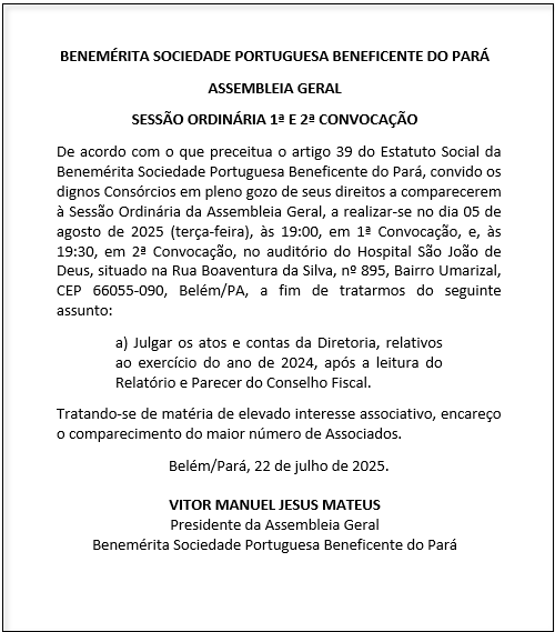 O Presidente da Assembleia Geral da Benemérita Sociedade Portuguesa Beneficente do Pará, Dr. Vitor Manuel Jesus Mateus, convida os dignos Consórcios a comparecerem à Sessão Ordinária da Assembleia Geral, a realizar-se no dia 05 de agosto de 2025 (terça-feira), às 19:00, em 1ª Convocação, e, às 19:30, em 2ª Convocação, no auditório do Hospital São João de Deus, situado na Rua Boaventura da Silva, nº 895, Bairro Umarizal, CEP 66055-090, Belém/PA, conforme as disposições previstas no artigo 39 do Estatuto Social da Instituição, com a finalidade de tratar do seguinte assunto: